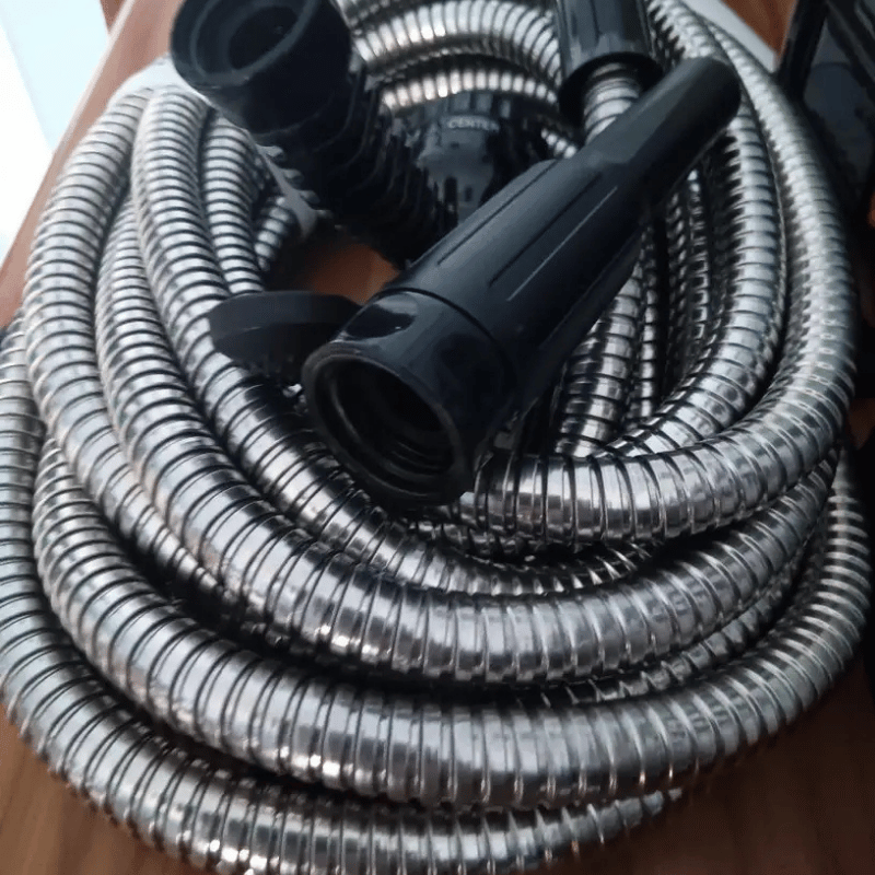 The stainless-steel outer layer may feel warm to touch after hours in direct sunlight, but it cools down quickly once water starts flowing. It’s completely safe to handle and far more resistant to UV damage than rubber or plastic hoses that crack or fade.